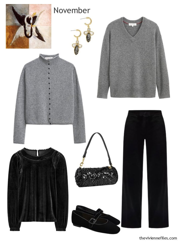 Earrings – Talbots; v-neck sweater – Alex Mill; grey cardigan – Alex Mill; black velvet top – Boden; sequined bag – Talbots; velvet pants – LOFT; velvet flats – J.Crew Factory